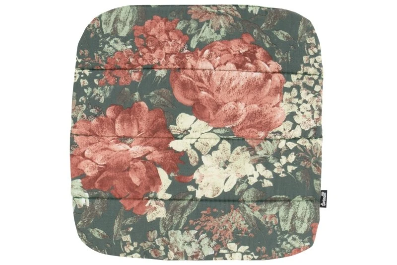 Een terra rozen dessin op een donkergroene achtergrond. De stof van het kussen bestaat uit een combinatie van katoen en polyester. Door deze combinatie is het kussen sterk, maar door het katoen toch ademend. Ook is het textiel makkelijk te reinigen!